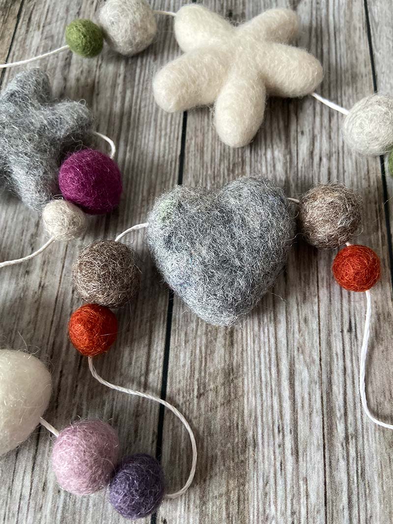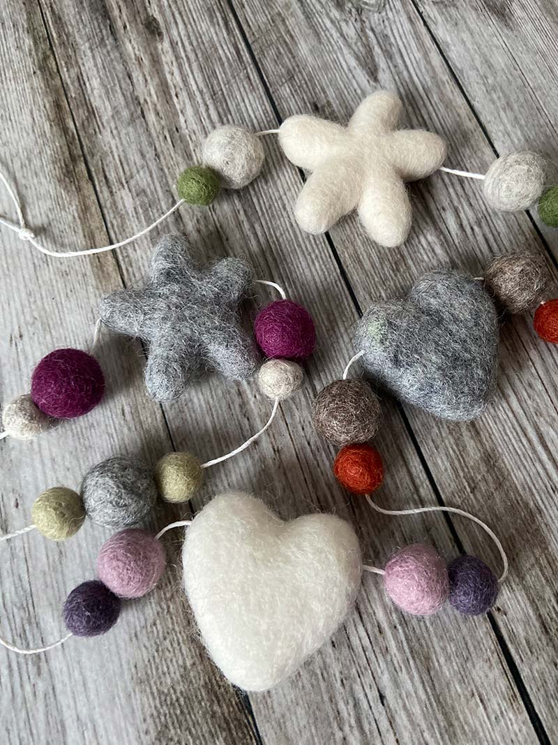 A pure wool felt garland of hearts and stars in beautiful soft neutral colours. A pretty addition to hang in a window or decorate a nursery, children’s playroom or bedroom.