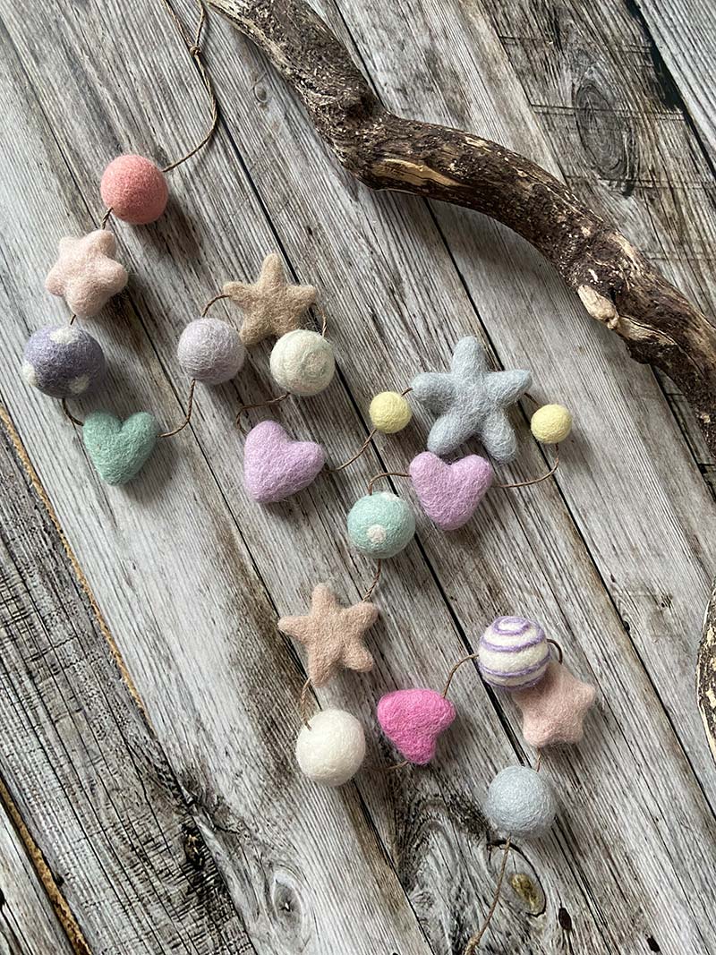 A pure wool felt garland with little hearts and stars to decorate a nursery, children’s playroom or bedroom.